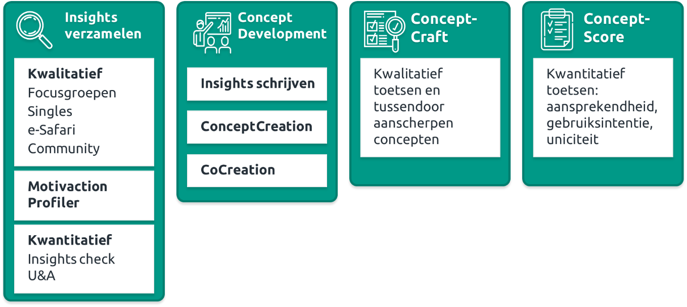 Bij innovaties draait alles om het optimaal aansluiten op de wensen en behoeften van de doelgroep. Dan vergroot je de kans op een succesvolle lancering en een langere levensduur van jouw product of dienst. Daarom werkt Motivaction met insights gedreven concepten. Deze concepten vervullen de daadwerkelijke behoeften van de doelgroep en bestaan uit de volgende bouwstenen:
