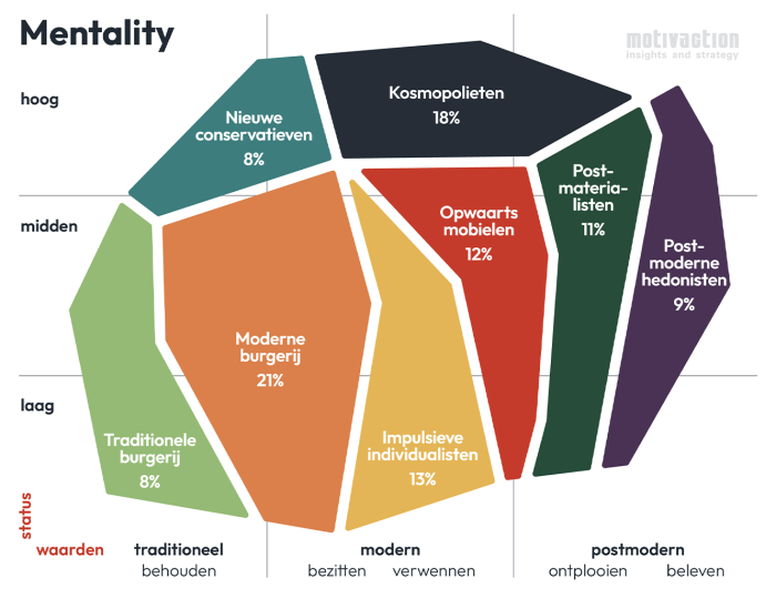 Het Mentality-model deelt Nederlanders op in acht milieus naar hun levensinstelling. Deze milieus definiëren we op basis van persoonlijke opvattingen en waarden die aan de leefstijl van elke groep ten grondslag liggen. Mensen uit hetzelfde milieu hebben gedeelde waarden ten aanzien van werk, vrije tijd en politiek, en tonen overeenkomstige ambities, drijfveren en consumentengedrag.