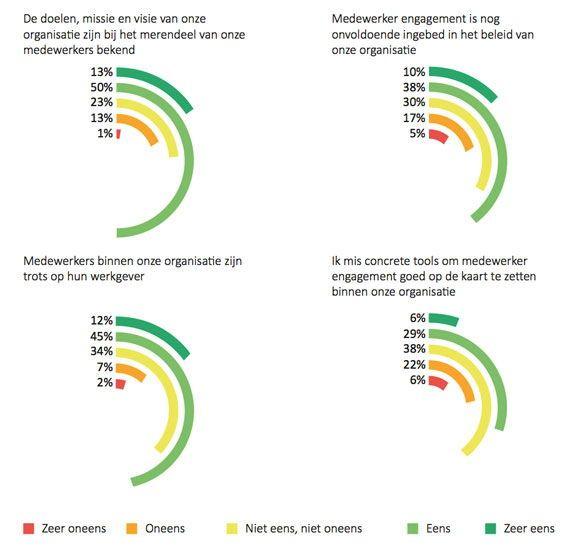 Meer dan de helft van de medewerkers in Nederland is trots op hun werkgever. Toch is hier nog een wereld te winnen want 34% van de ondervraagden ‘weet niet’ of hun medewerkers wel of niet trots zijn. Bijna de helft zegt dat de organisatie nog onvoldoende beleid heeft gemaakt rondom engagement. En 1 op de 3 medewerkers mist concrete tools om medewerker-engagement goed op de kaart te gaan zetten.