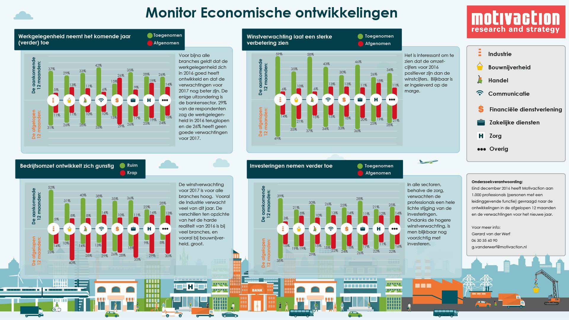 Eind 2016 deden we een trendmeteronderzoek (n = 1.000) naar de evaluatie van de economische ontwikkelingen in 2016 en de verwachtingen voor 2017. Met dit onderzoek brachten we de trends en ontwikkelingen voor acht branches in kaart. De vragen gingen over de evaluatie en verwachtingen ten aanzien van economische indicatoren als orderpositie, omzet, winstgevendheid en werkgelegenheid. De resultaten zijn samengevat in een Infographic.