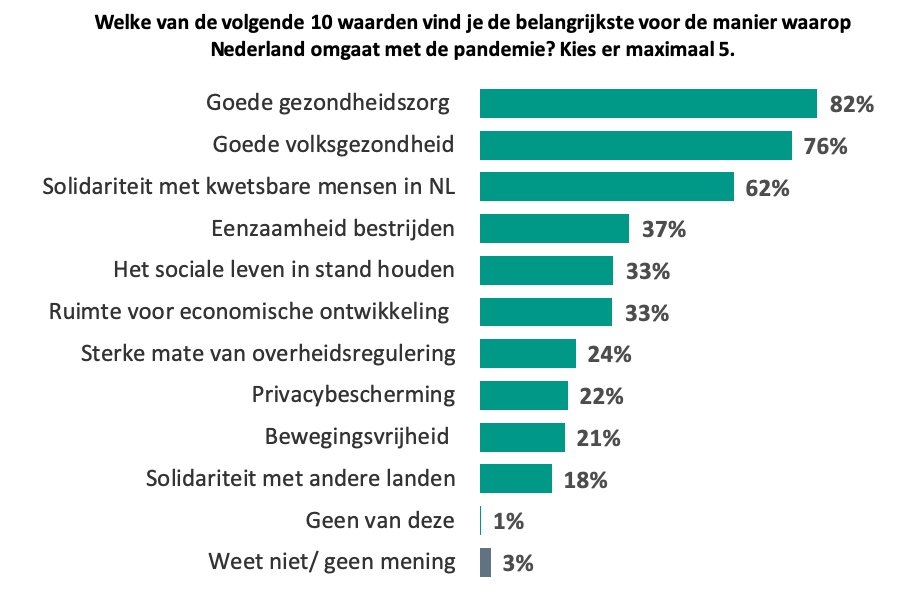 Nederlanders vinden een goede gezondheid en gezondheidszorg, en solidariteit met kwetsbaren, nog steeds verreweg de belangrijkste richtinggevende waarden voor de omgang met de coronapandemie. Wel nemen het in stand houden van het sociale leven en ruimte voor economische ontwikkeling aan belang toe. Twee weken geleden rekende een kwart deze waarden tot de belangrijkste uit een lijst van tien, inmiddels is dat een derde.