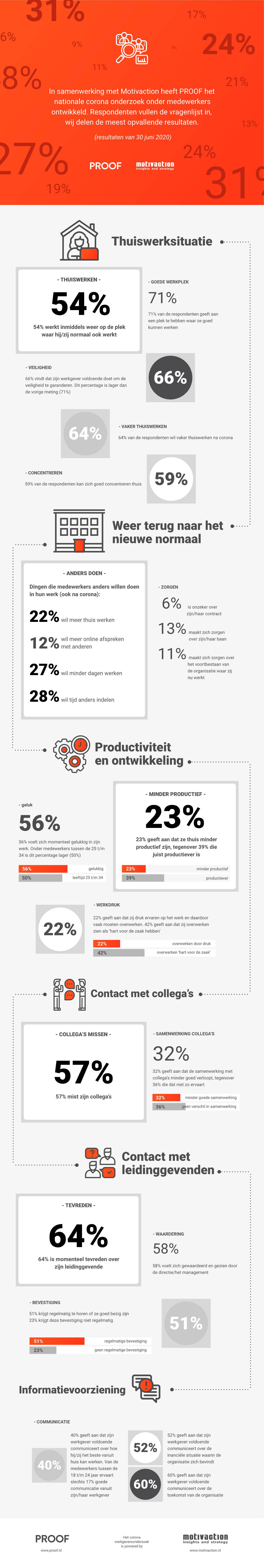 De meeste medewerkers hebben na vier maanden thuiswerken een eigen modus gevonden, volgens de laatste cijfers van de corona engagement monitor van Motivaction’s label voor arbeidsmarktonderzoek Sparkey en communicatiebureau PROOF. 64% van de ondervraagden geeft aan ook na corona vaker thuis te willen werken. ‘Dit signaal is helder maar vraagt wel om een goede rol vanuit communicatie’ aldus Bea Aarnoutse van PROOF: ‘Iedereen richt op dit moment op zijn eigen manier het werk in en is allang blij als dat een beetje goed gaat. Maar daardoor is er wel de kans dat we afdrijven van gezamenlijke organisatiedoelstellingen. Verwachtingen managen en handvatten bieden, gebeurt nu onvoldoende.’