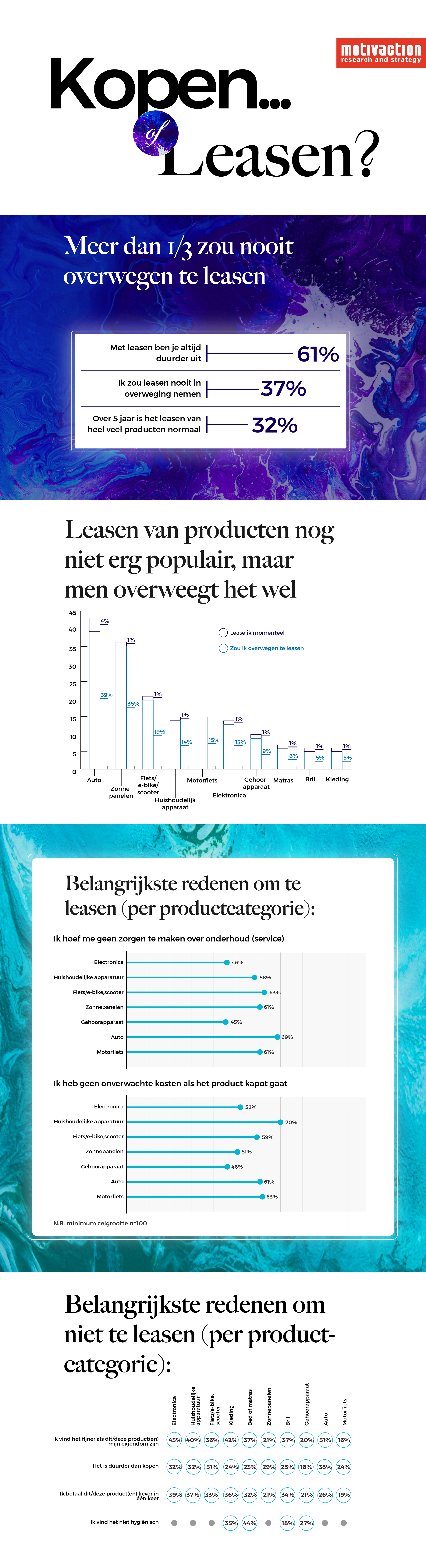 Je fiets leasen bij Swapfiets, je spijkerbroek bij MUD en je koelkast bij Dixons: het is tegenwoordig mogelijk om allerlei producten te leasen. Nederland staat daar ook steeds meer voor open: voor precies eenderde van de consumenten is het leasen van producten inmiddels zeker een optie. Dertig procent staat er neutraal tegenover, terwijl 37% niet bepaald gecharmeerd is van dit idee. Ontzorgen wat betreft onderhoud en niet geconfronteerd kunnen worden reparatiekosten zijn de belangrijkste redenen om wél te willen leasen. De wens om eigenaar te zijn van een product, de voorkeur om in één keer te betalen en het idee dat leasen duur(der) is zijn de belangrijkste barrières. Dit blijkt uit representatief online onderzoek van Motivaction onder 1.066 Nederlanders, uitgevoerd in het najaar van 2018.