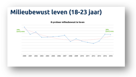 Een blik op de data laat zien dat het op dat vlak wel meevalt, of tegen, afhankelijk van hoe je ernaar kijkt. We vroegen in 2000 aan jongeren hoe milieubewust zij leefden, en deden dat vorig jaar ook aan de huidige jeugd. Het blijkt dat die verschillen helemaal niet zo groot zijn, en dat milieubewust leven zelfs iets belangrijker was in 2000.