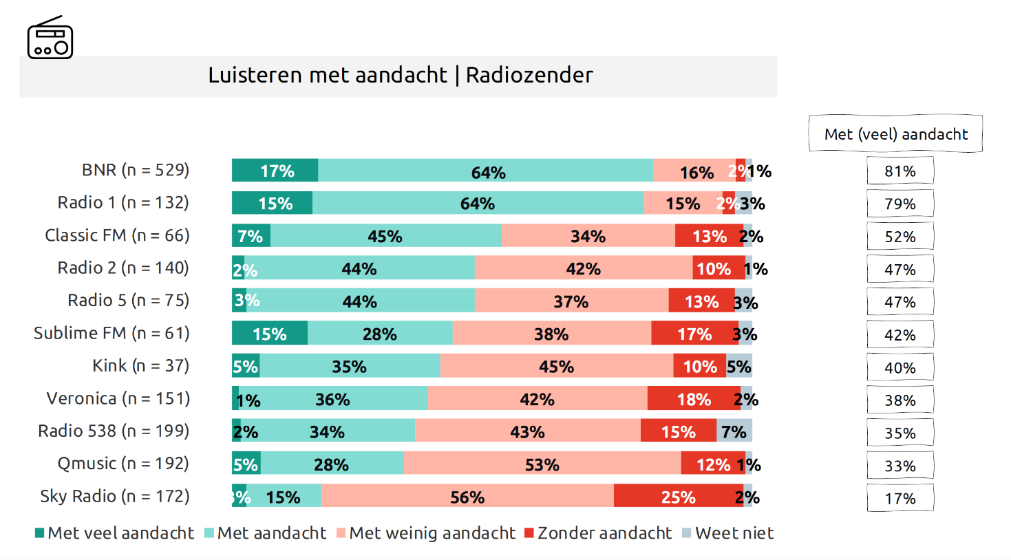 - 81% van de BNR-luisteraars geeft aan met (veel) aandacht naar BNR te luisteren, tegenover een gemiddelde van 41% van de luisteraars van overige zenders.