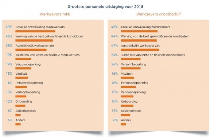 Dit blijkt uit de HR Marktmonitor van Unique en Motivaction waaraan ruim 2100 werkgevers uit het mkb en grootbedrijf en 2300 werknemers meewerkten. Bij het grootbedrijf is een aantrekkelijke werkgever zijn de grootste uitdaging (47%), gevolgd door groei en ontwikkeling van medewerkers (45%) en werving (44%). Binnen het mkb staat de ontwikkeling van medewerkers met 49 procent op de eerste plaats. Werving van gekwalificeerde kandidaten (46%) en aantrekkelijk werkgeverschap (38%) komen op de tweede en derde plaats.