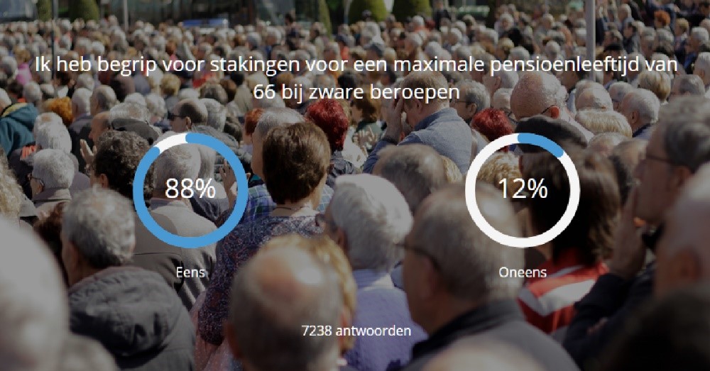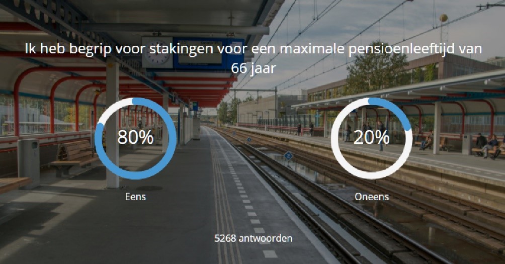 Op 18 maart legden wij onze StemPunt-leden de vraag voor hoe zij staan tegenover de landelijke staking voor pensioen. Hierop kwamen ruim 7.200 reacties. Dat is 20% meer dan gebruikelijk op onze ‘Topic van de Dag’. Een zeer ruime meerderheid van 88% betuigde steun door aan te geven achter de staking te staan. Op 28 mei legden we deze vraag nogmaals aan de StemPunt-leden voor, de dag dat het OV nagenoeg geheel plat lag. Ook deze staking kon op grote steun rekenen: 80% geeft aan begrip te hebben voor stakingen gericht op een maximale pensioenleeftijd van 66 jaar. Deze keer reageerden er nagenoeg 5.000 Stempuntleden op de vraag van de dag.
