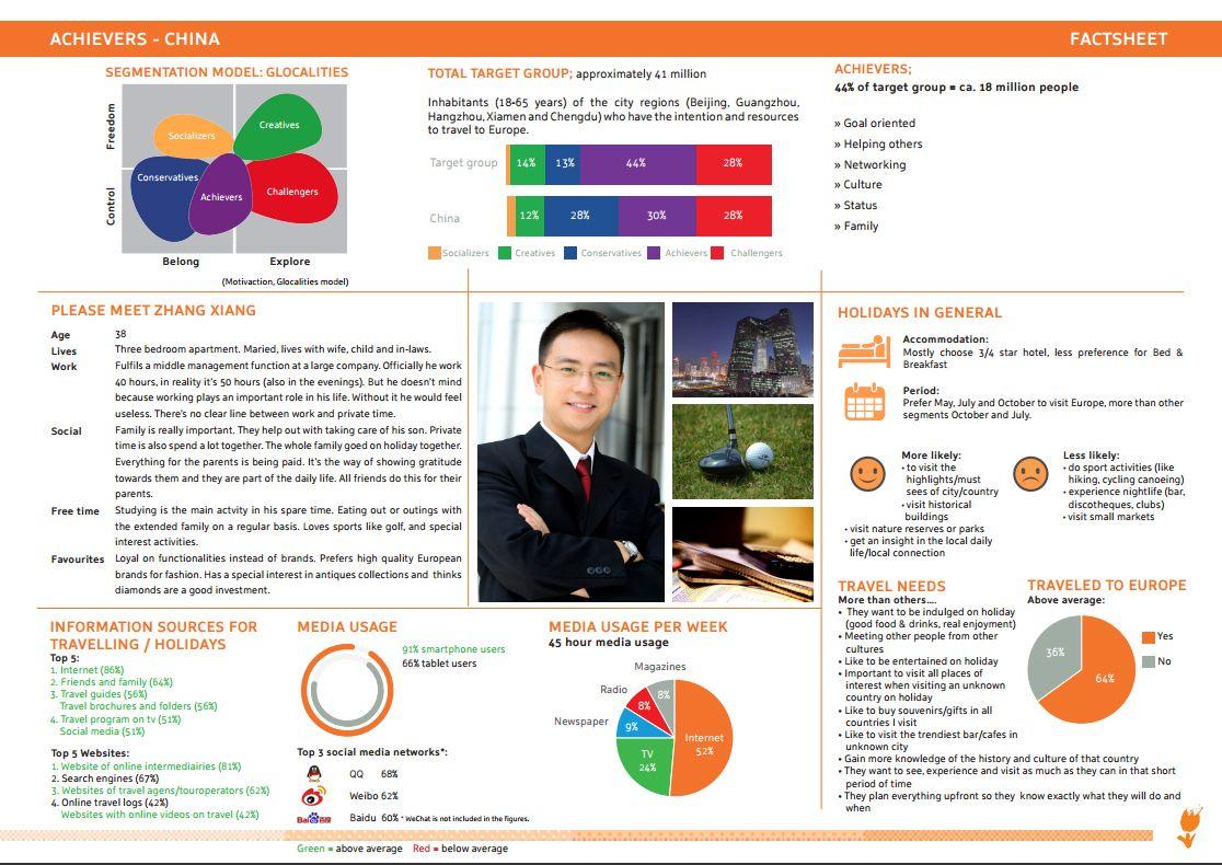 In order to get the most from target groups, we can use personas as a practical tool. Because of cultural differences, the personas we have developed for the Western market are rarely internationally applicable. Because of this, we developed two entirely new Chinese Glocalities-based personas: Ding Yi and Zhang Xiang to identify and profile our Chinese target audiences. NBTC commissioned Motivaction to conduct research amongst Chinese people who are planning to visit Europe in the near future. This research was carried out across the Chinese regions of Beijing, Shanghai, Guangzhou, Hangzhou, Xiamen and Chengdu to get adequate information to form the basis of our personas.