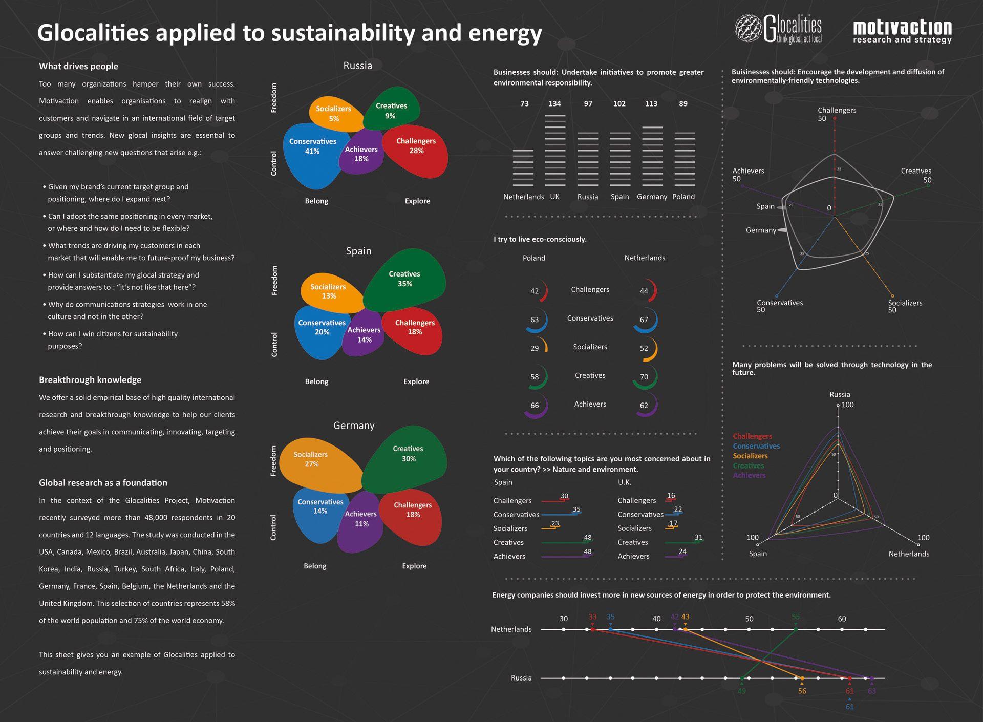 For the Glocalities project, Motivaction interviewed more than 48,000 respondents in 20 countries and 12 languages in December 2013 and January 2014. The research was conducted in America, Canada, Mexico, Brazil, Australia, Japan, China, South Korea, India, Russia, Turkey, South Africa, Italy, Poland, Germany, France, Spain, Belgium and the Netherlands.