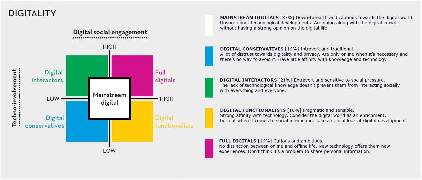 The Digitality model is based on four classifications: high and low digital social engagement and high and low technological-involvement. This is visualized along two axes, which make up the five types of digital citizens. These five types all score differently on the following six underlying digital values that characterize digital behaviour: