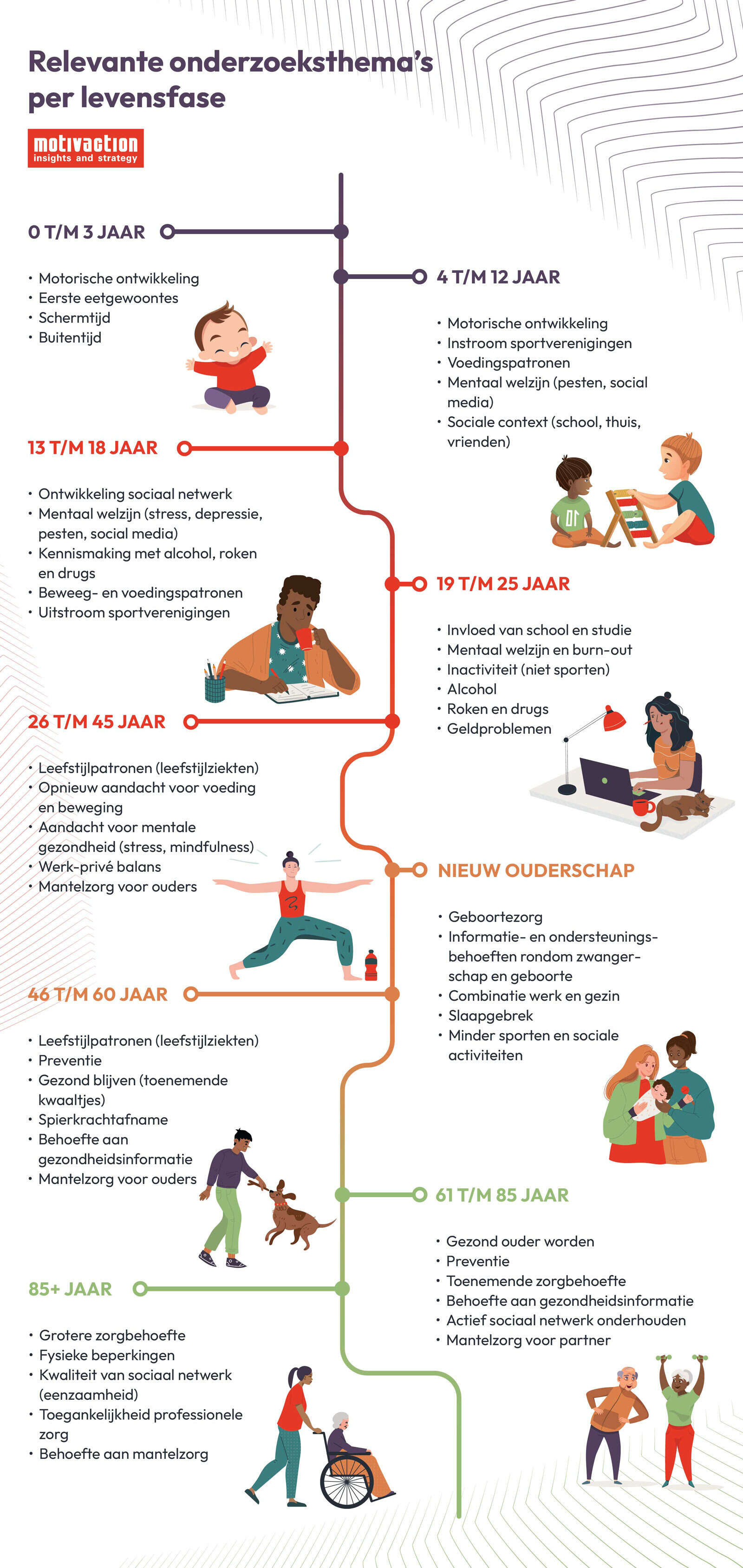 Bij Motivaction zijn wij overtuigd dat levensfases een grote rol spelen in vitaliteit en gezondheid. Leeftijd, leefsituatie, gezin en werk zijn van grote invloed op de leefstijl en gezondheid van mensen. Daarom nemen wij ook deze factoren mee in onderzoek. Bekijk onderstaande infograpic welke thema's en oplossingen we per levensfase behandelen.