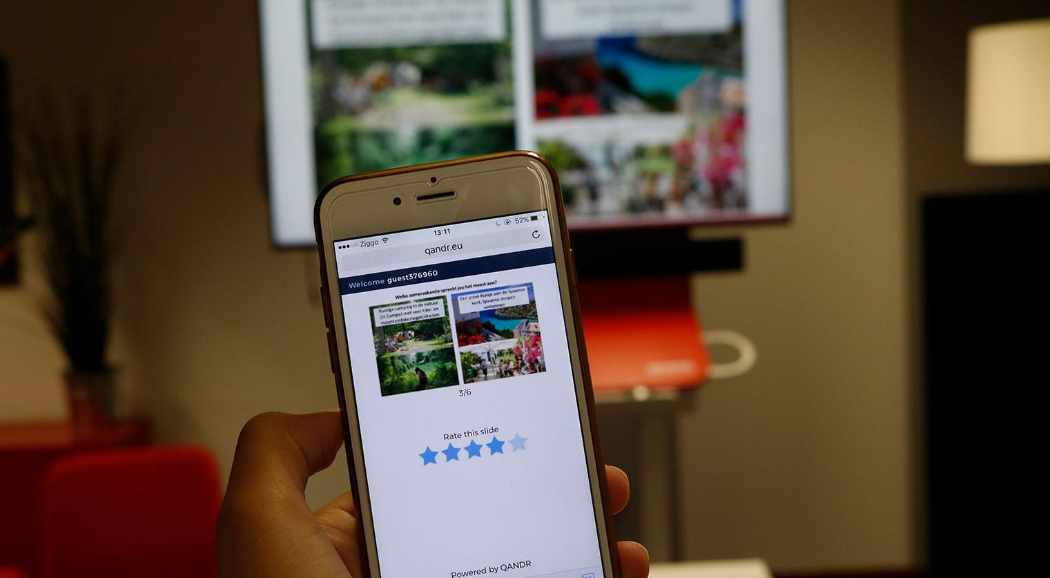 Deze online tool helpt door middel van gamification om een visuele insteek te geven aan kwalitatieve groepsdiscussies. Deelnemers voeren heel eenvoudig met hun mobiele telefoon opdrachten uit. De resultaten zijn direct zichtbaar op een groot beeldscherm. Hierdoor leggen we op een leuke, visuele en creatieve manier spontane meningen, reacties en opinies vast. We werken met moodboards, woordenwolken, stellingen, kwadranten en polls.