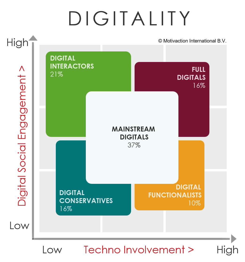 Het Digitality-doelgroepenmodel deelt mensen in op basis van hoe zij omgaan met telecom en informatietechnologie, de wijze waarop zij hun digitale leven hebben ingericht en de drijfveren die hieraan ten grondslag liggen.