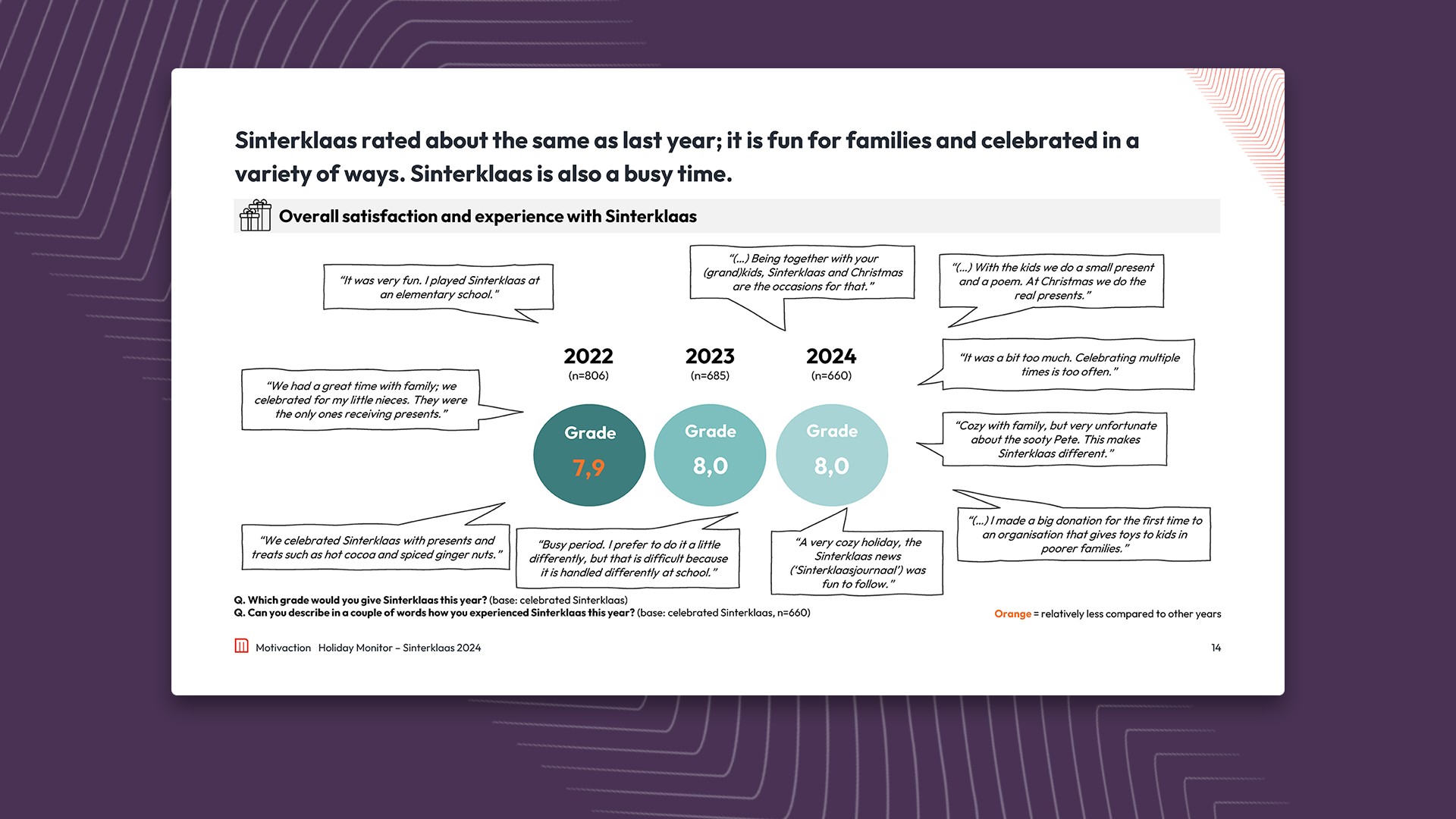 The way Sinterklaas is celebrated is evolving. Three in four celebrants give and receive presents, while writing poems and attending the arrival parade are becoming more popular, and fewer people watch Sinterklaas movies. Baking and buying ‘pepernoten’ remain part of the ritual, but overall spending is stable rather than growing. Brands like Verkade and Bolletje continue to dominate the Sinterklaas association.