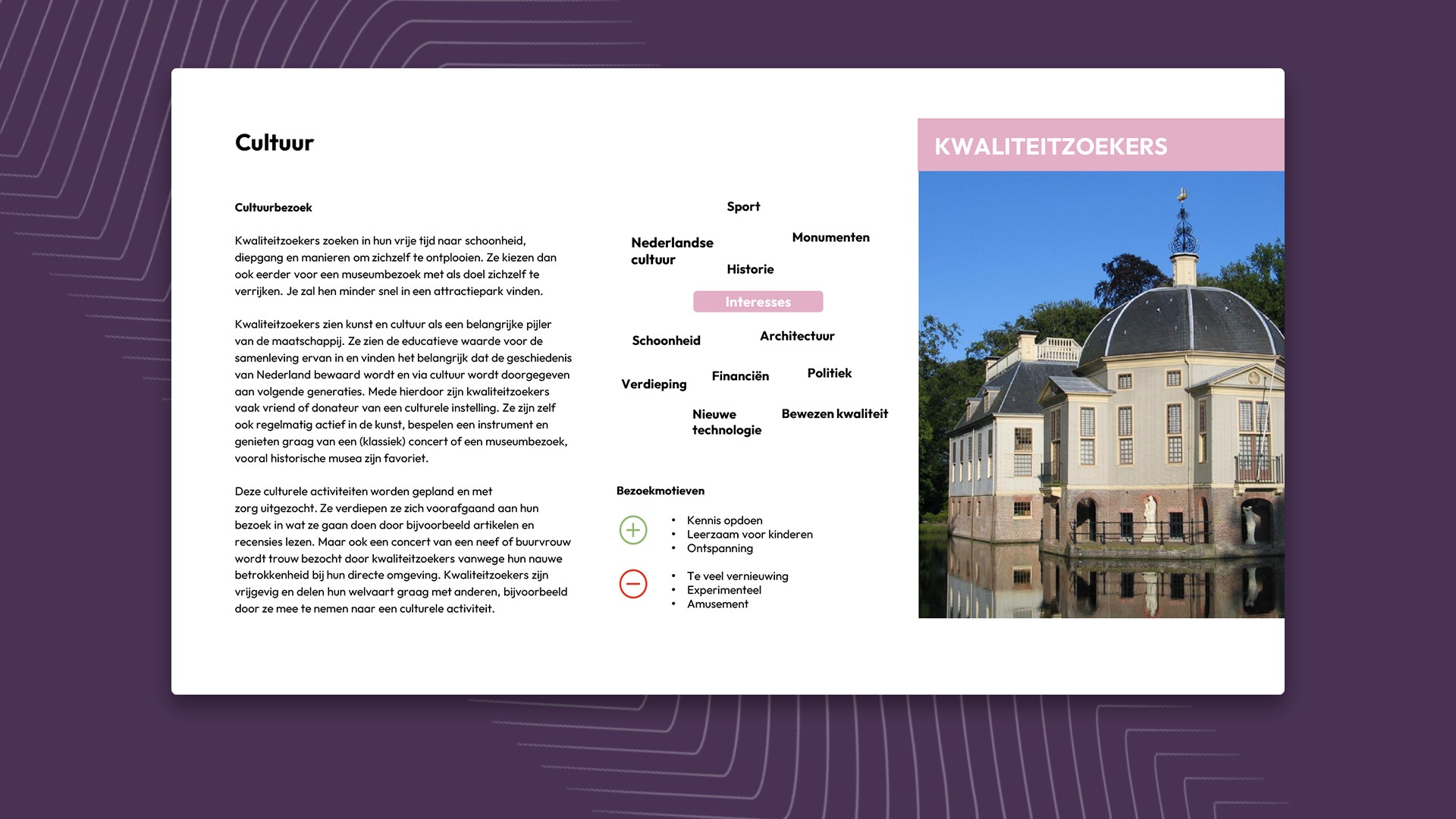 Welke tentoonstellingen trekken een jong, creatief publiek? Welke doelgroepen zijn juist liever buiten actief? En wie vindt ontspanning vooral op de bank met een goede serie? Met de Cultuur- & vrijetijdsprofielen breng je het vrijetijdsgedrag van Nederlanders haarscherp in kaart. Van museumliefhebbers tot festivalgangers en van thuisblijvers tot buitenmensen: deze profielen geven inzicht in het waarom achter wat mensen in hun vrije tijd doen.