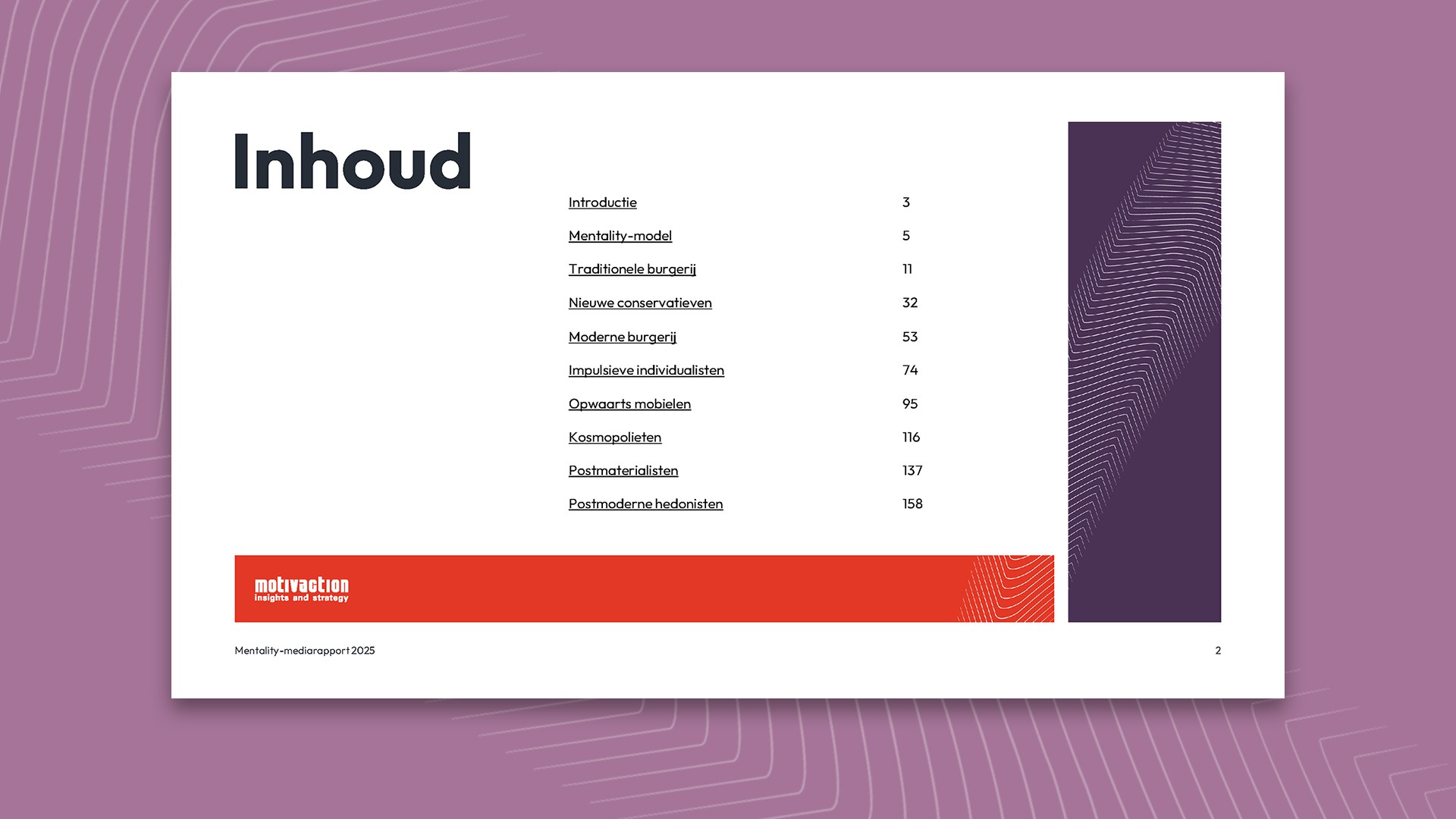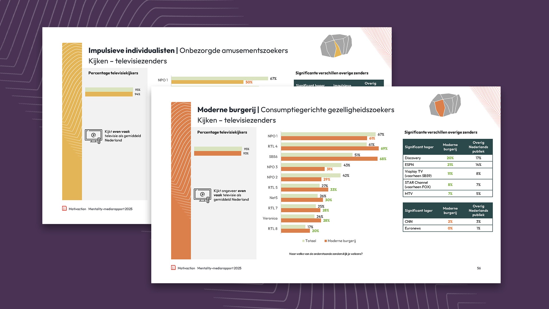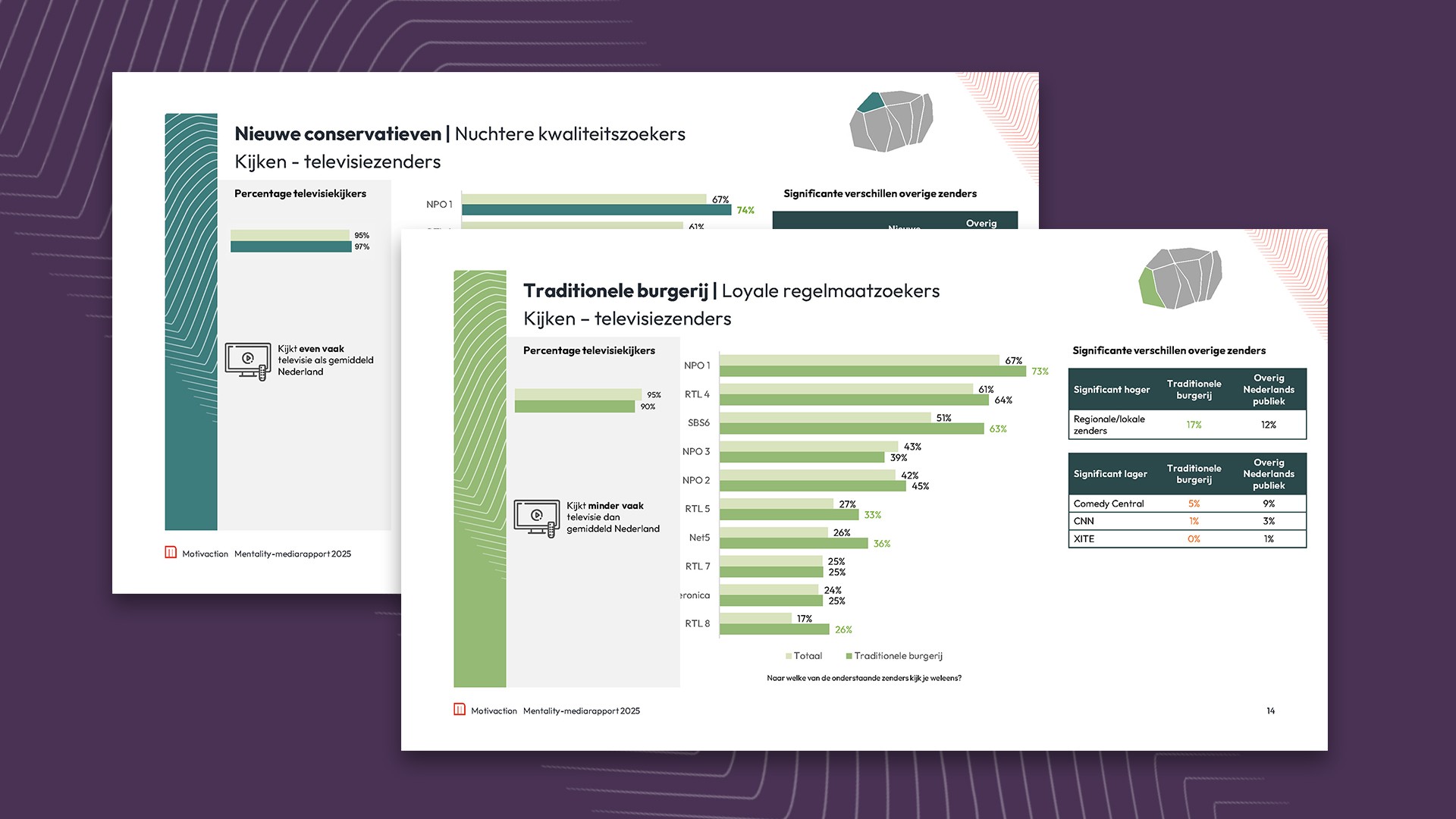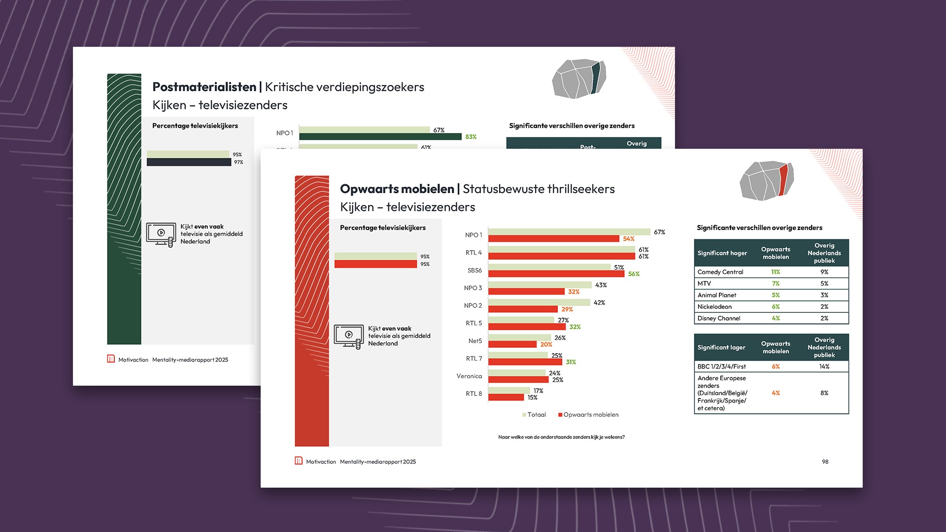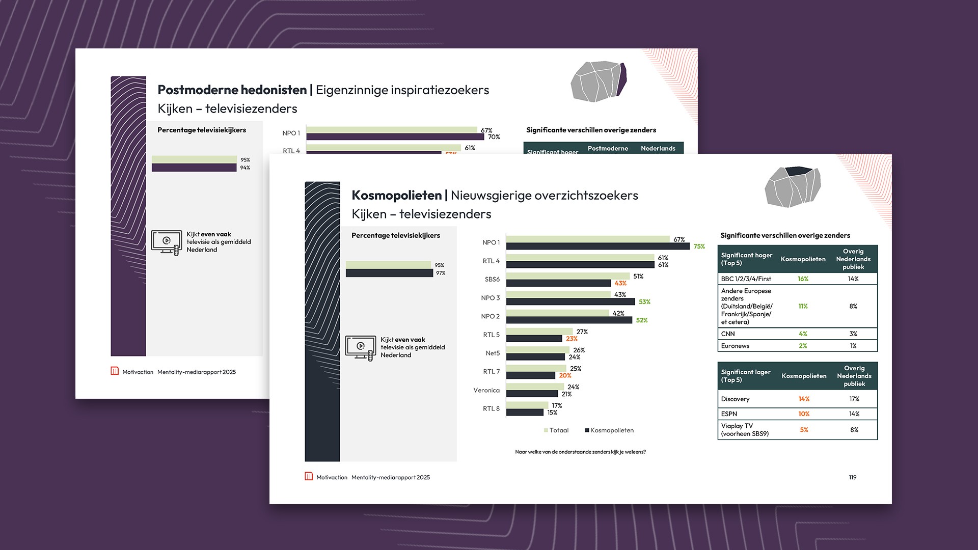 Begrijp wie kijkt, leest, luistert – én waarom. Het Mentality Mediaprofielen-model onderscheidt acht groepen die elk op hun eigen manier media gebruiken, van krant tot TikTok en van lineair tot on demand. Niet leeftijd of geslacht, maar waarden en leefstijl verklaren hun keuzes voor kanalen, formats en content.
